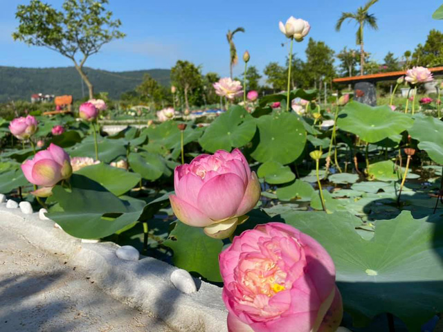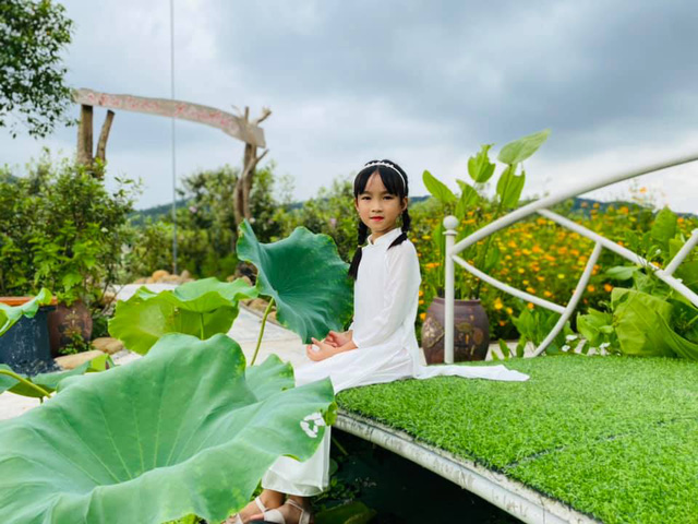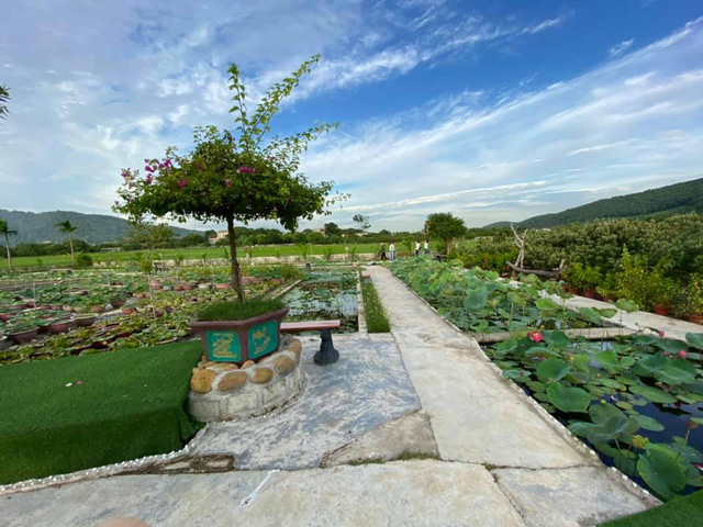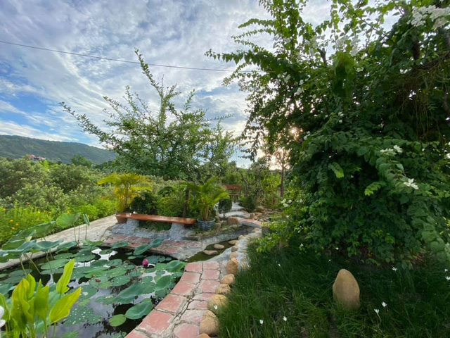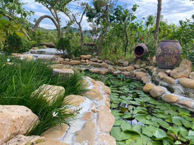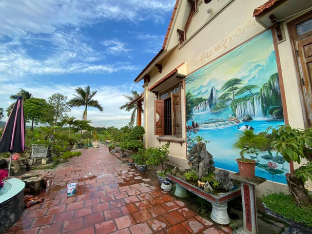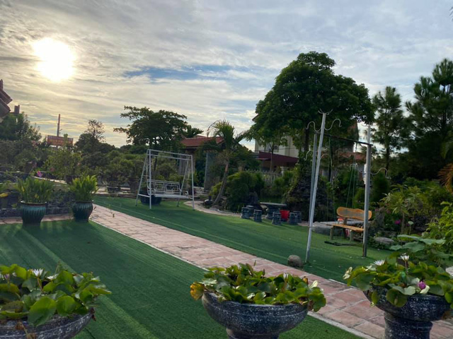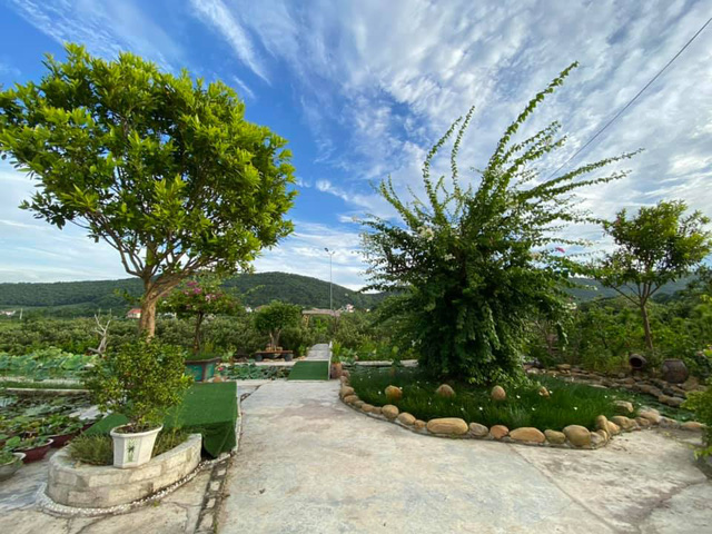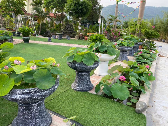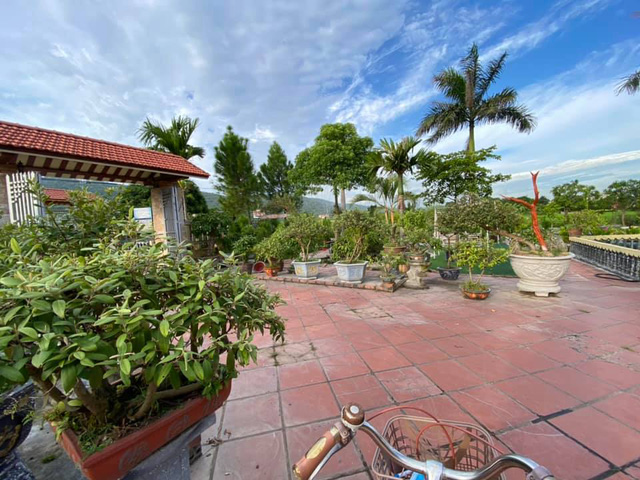 Sân vườn rộng rãi, thoáng mát với hàng trăm loại cây cối, hoa tạo nên một không gian sống vừa thoải mái vừa gần gũi với thiên nhiên của gia đình.